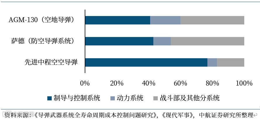 在量或价方面具有优势的几种各类导弹(空地导弹、面空导弹以及空空导弹)中,战斗部、动力系统、制导与控制系统及弹体结构等四个分系统价值量占比如下图所示,可以看出,制导控制系统成本占比较其他分系统明显更加突出。