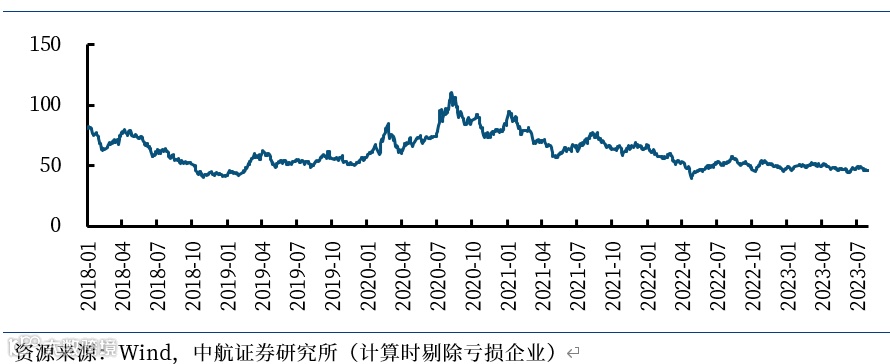 我们对中航证券航天行业指数标的进行PE(TTM)统计,截至2023年7月末,指数市盈率为46.49倍,较3月末下降6.18%,处于2018年以来的9.27%分位。可以看出,相较于2022年11月与12月的杀估值,2023年3月,航天产业整体估值水平曾一度修复至历史30%分位,但4-7月估值分位再次下探到历史较低水平。