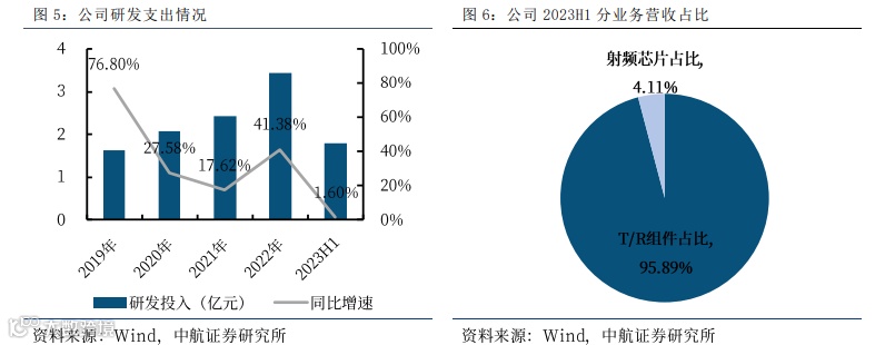 1、相控阵T/R组件和射频模块:2023H1收入(18.42亿元,+19.84%)同比小幅增长,收入占比(95.89%,+7.35pcts)进一步提升。2023H1公司顺利完成各类重点型号T/R组件的生产交付,产品销售收入实现较快增长。同时,公司面向宽带、高频应用积极推进新一代产品研制,积极开展系列化功率放大器、低噪声放大器、多功能芯片等有源芯片与IPD无源集成芯片的自主研制工作,并批量工程化应用于各类宽带、高频、大功率有源相控阵T/R组件产品,研制的GaN射频芯片已在T/R组件中得到广泛的工程应用。