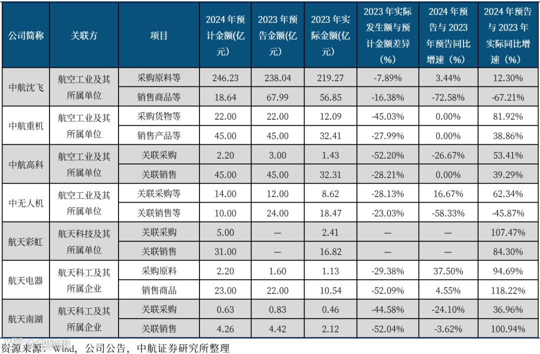 军工央企下属上市企业公告关联交易时常作为业绩预测指标,预计关联交易的增速如果与预期出现偏差,也将影响股价表现。根据我们统计的多个军工央企下属上市企业的关联采购以及关联销售数据来看,2024年,多家军工企业对其相关领域下游需求信心仍足。
