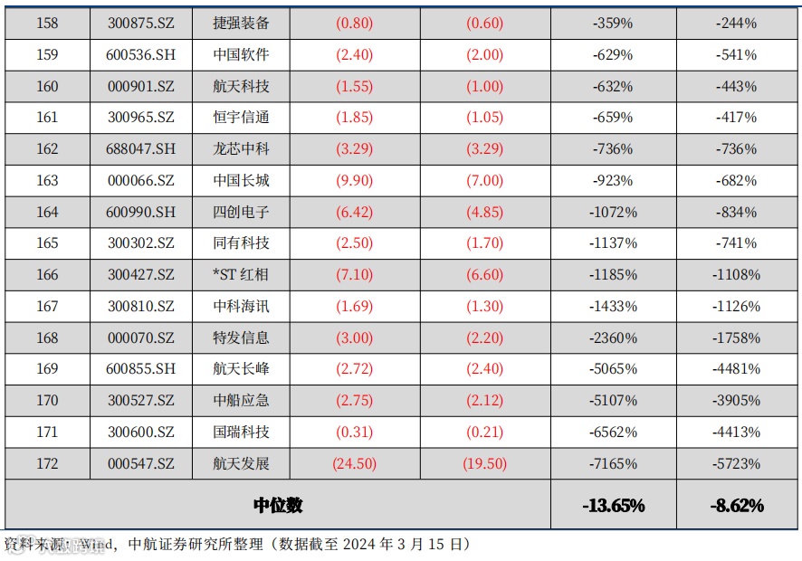 截至2024年3月29日,共计172家企业公布2023年业绩预告(快报)或正式年报,其中79家业绩预增,93家业绩预减,整体来看,目前发布预告(快报)或正式年报的上市公司净利润增速下限中位数为-13.65%,增速上限中位数为-8.62%。