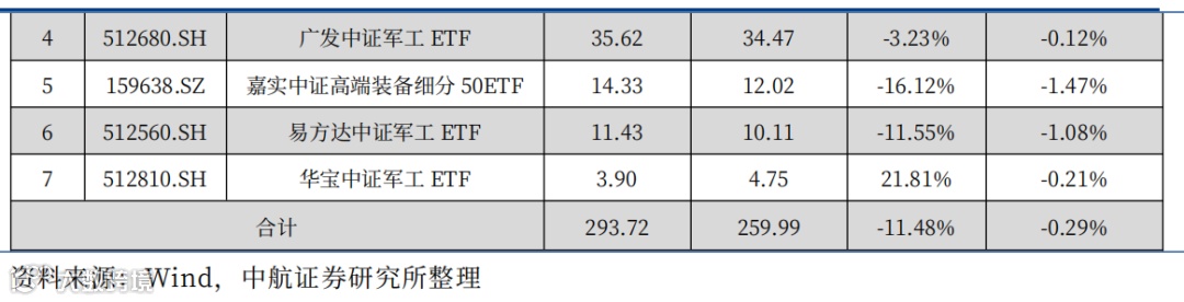 本周,军工板块(申万)成交额为1636.15亿元(-8.60%),占中证全指成交额比例为3.58%(+0.17pcts),主要军工ETF基金份额下降0.29%(2024年年初至今下降11.48%)。