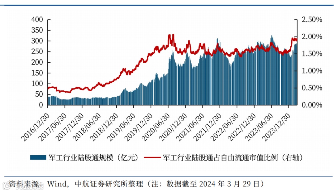 本周,北向资金累计净流出53.81亿元。军工行业陆股通占自由流通市值比例为1.95%,较3月22日环比提升0.06个百分点。