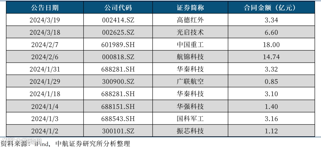 从多家公司公布的日常经营重要合同公告来看,2024年军工上市公司在手订单充足,业绩有望兑现在2024年底。