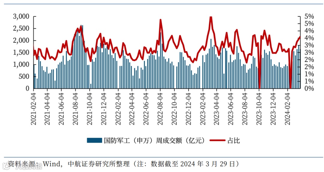 截至2024年3月28日,军工行业的融资余额合计747.71亿元,比上周环比下降0.92%,占两市融资余额比例为4.98%。
