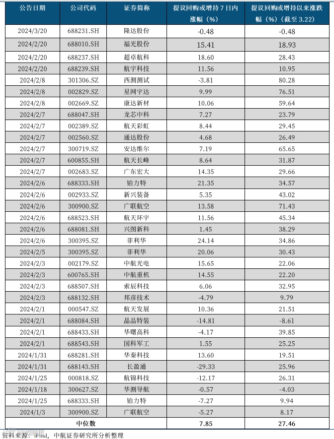 表6 2024年以来军工上市公司增持、回购行为一览