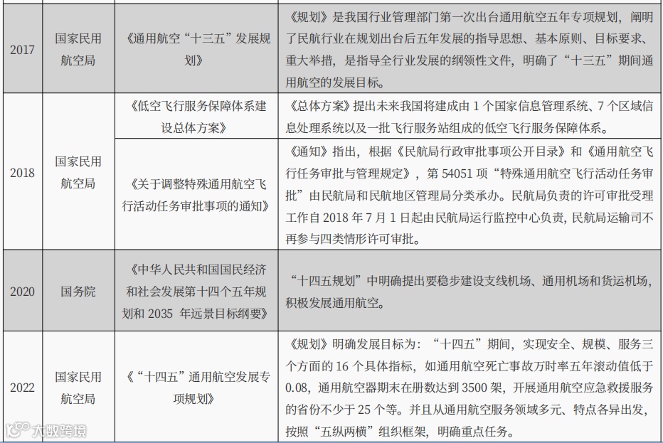 早在2024年,中央军委发布的《关于深化我国低空空域管理改革的意见》,明确了低空空域管理改革的目标任务;2012年,《国务院关于促进民航业发展的若干意见》指出要大力发展通用航空,让通用航空产业有法可依;2016年,《国务院办公厅关于促进通用航空业发展的指导意见》对通用航空业与经济融合发展做出的总体谋划和系统部署,为我国通用航空业发展提供了战略指引。但由于低空空域及行业政策法规尚需时间进一步明确和完善,低空经济行业并未得到高速的发展。