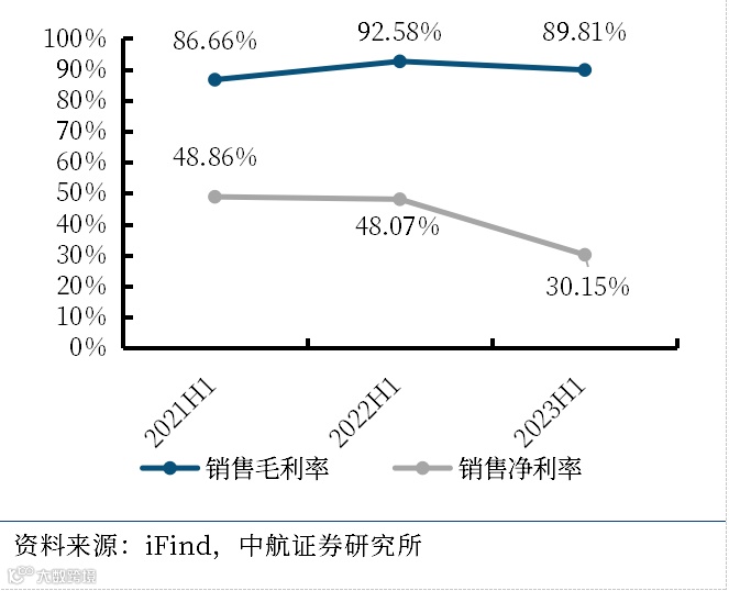 事件:公司8月16日公告,2023年上半年实现营收(1.11亿元,+6.08%),归母净利润(0.34亿元,-33.47%),毛利率(89.81%,-2.77pcts),净利率(30.15%,-17.92pcts);2023Q2实现营收(0.70亿元,同比-5.39%),归母净利润(0.26亿元,同比-39.54%),毛利率(90.68%,同比-3.41pcts),净利率(37.79%,同比-21.35pcts)。