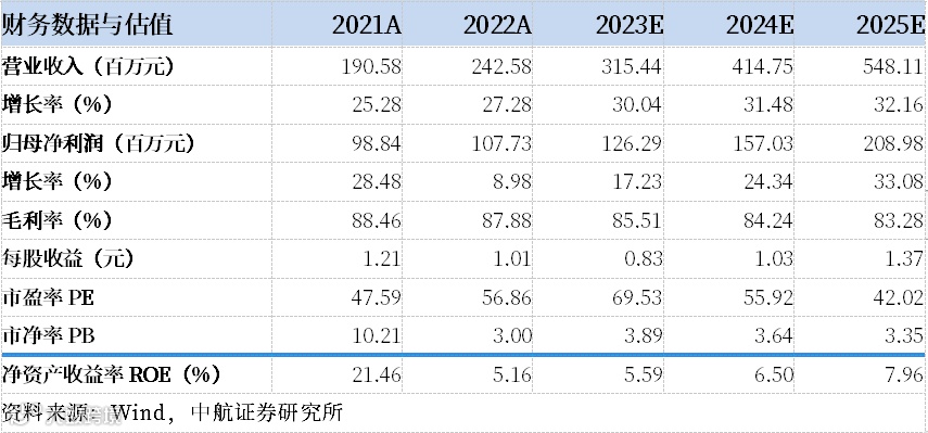 基于以上观点,我们预计公司2023-2025年的营业收入分别为3.15亿元、4.15亿元和5.48亿元,归母净利润分别为1.26亿元、1.57亿元及2.08亿元,EPS分别为0.83元、1.03元、1.37元,我们维持“买入”评级,当前股价分别对应70倍、56倍及42倍PE。