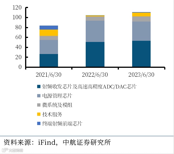 分业务来看,报告期内,公司主要产品包括终端射频前端芯片、射频收发芯片及高速高精度ADC/DAC、电源管理芯片、微系统及模组等,同时围绕相关产品提供技术服务。公司各业务收入变化如下: