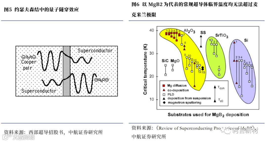 宏观量子效应是超导电子学的基础,众多科学家及学者根据BCS理论作出了一系列的理论延伸:1)1962年,剑桥大学的约瑟夫森(B. Josephson)预言,“电子对”能够穿过薄绝缘层(量子隧穿),当由薄绝缘层隔开的两块超导体(“约瑟夫森结”结构)之间有电流通过时,其中并不会出现电压,这一现象被称为“约瑟夫森效应”。换言之,该现象是一种横跨约瑟夫森结的超电流现象,即超导电流可以在“超导体—绝缘体—超导体”的结构中产生;2)1968年,美国物理学家麦克米兰根据BCS理论得到超导体临界温度上限的公式,推算出超导体的临界温度一般不太可能超过39K(约-234℃),39K这个温度也被称为“麦克米兰极限”。该极限温度曾一度被主流学界所接受,直到1980年代高温超导体的蓬勃发展突破了这个理论极限;