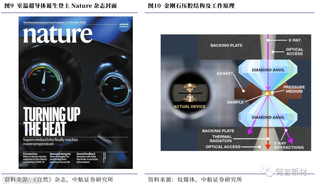 寻找能大规模应用的室温超导体是当今超导研究人员的心之所向。超导体的应用解决了输电过程中造成的热损耗,具备着常规金属材料无法企及的性能。由于超导体往往需要在非常低的环境温度中应用(低于其超导临界温度),而低温环境往往需要依赖于液氦或其他设备来维持,这极大地增加了超导材料的应用和维护成本,导致具备如此颠覆性的材料无法在低成本下被大规模应用。因此,寻找具备更高临界温度的超导体是解决超导材料应用的关键,而研发出室温超导体成为了超导领域研发人员的不懈追求。2020年,迪亚斯在实验室将氢、碳和硫元素,在金刚石压腔中通过光化学合成简单的碳质硫氢化物(CSH),并将其超导临界温度提升至15℃,这是人类第一次观察到室温超导体,具有里程碑式的意义。但在金刚石压腔中观察到的超导现象被重重极端条件所限制:1)该现象的环境压力为2670亿帕,相当于标准胎压的100万倍;2)产生超导现象的材料数量极其微量,并无法产生实际的应用。因此,下一个科研目标则是争取找到在较低压力下制造室温超导体的方法,以实现大批量生产。若常温超导能够得到规模化应用,必将带来一场全新的能源革命,人类将步入崭新的超导时代。
