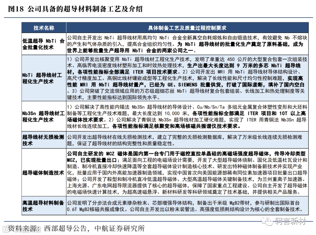 公司背靠西北有色金属研究院,深耕超导材料领域二十年,在业内具备的核心竞争力包括研发技术壁垒、设备壁垒及市场先入壁垒。公司自主开发了全套低温超导产品的生产技术,代表我国完成了ITER计划(国际热核聚变实验堆计划)的超导线材交付任务,实现了MRI(磁共振成像仪)超导线材的批量生产;同时开发了高性能Bi系和MgB2高温超导材料制备技术,产品的核心技术达到国际先进水平。技术储备方面,公司具备低温超导NbTi合金批量化生产技术、Nb3Sn超导线材工程化生产技术、Nb3Sn超导线材工程化生产技术、超导磁体制备技术等,同时具备高温超导材料制备技术,产品的核心技术达到国际先进水准;