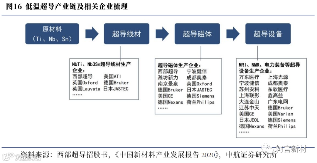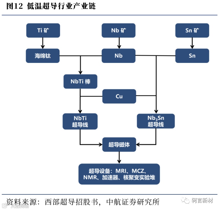 以铌基超导材料(NbTi和Nb3Sn)为主的低温超导材料具有优良的机械加工性能和超导电性,是目前最主要的实用化超导材料。低温超导产业链主要包括上游原材料、中游超导线材、超导磁体及下游超导设备四个环节: