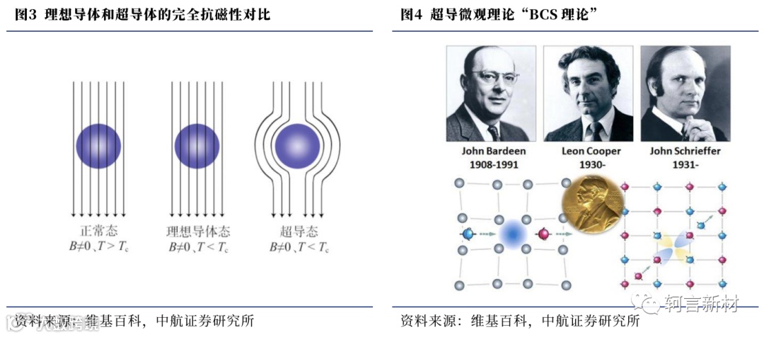 超导材料的发展离不开理论的支撑,1933年,德国物理学家迈斯纳(W. Meissner)和奥林菲尔德(R. Ochsenfeld)共同发现了超导体的另一个重要特征——完全抗磁性,即当材料处于超导状态时,将完全排斥磁场,超导体内的磁感应强度为零,人们将这种现象称为“迈斯纳效应”。因此,判断一种材料是否具备超导电性,必须要看其是否同时具备完全导电性和完全抗磁性。随后,巴丁(J. Bardeen)、库珀(L. V. Cooper)和施里弗(J. R. Schrieffer)在1957年提出了著名的BCS理论,它把超导现象看作一种宏观量子效应,成功地解释了金属或合金超导体的超导电性微观机理。由于电阻是由电子定向运动时与金属晶格发生碰撞而形成的,而在超导临界温度以下,超导体中的电子通过与晶格振动声子的交换来实现无损耗运动,即没有电阻产生,因此能够实现超导电性。至此,超导体的三大基本特性完全导电性、完全抗磁性和宏观量子效应均已奠定;