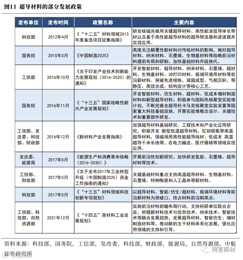 根据超导材料的基本特性,其不仅在临界温度下具有零电阻特性,而且在一定的条件下还具备完全抗磁性和宏观量子效应等常规导体所不具备的特性,这些性质使超导体能够实现大电流传输、获得强磁场、实现磁悬浮、检测微弱磁场信号等多种应用,因此其被广泛应用在电子通信、电力能源、交通运输、国防军事、医疗器械等诸多领域。由于超导材料和技术涉及的领域之广,发达国家不惜投入巨资开展前期研究和产业化应用实验。我国在产业政策方面也对超导材料的发展方向做出了相关支持,历年出台的各类新材料行业发展政策推动了超导材料的发展和革新。《中国制造2025》将超导材料列为前沿颠覆性新材料中需重点发展的项目,《“十三五”国家战略性新兴产业发展规划》指出应积极参与国际热核聚变实验堆计划(ITER),不断完善全超导托卡马克核聚变实验装置等国家重大科技基础设施。由于超导材料的应用不仅能提高电力生产、传输等领域的工作效率,也能对资源的节约起到举足轻重的作用,在这个能源紧缺的时代,超导材料科研技术和生产技术的飞跃势必带来新一轮的能源革命;