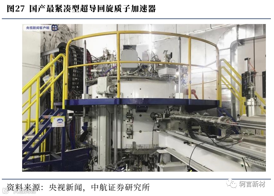 以加速器为代表的大科学工程自上世纪80年代以来一直是高技术发展水平和综合国力发展的象征,以超导磁体为核心的加速器系统是相关装置的核心。高能质子加速器是超导磁体在大科学工程中应用的一个重要的领域,其包括超导直线加速器、超导回旋加速器、超导同步加速器等设备。超导材料是加速器磁体的重要组成部分,超导磁体的应用可以在很小的激磁功率下产生强大的约束磁场,从而大幅缩减加速器的尺寸,降低加速器功率消耗,从而优化超导加速器的经济效益。随着加速器市场需求的增加,超导线材和超导磁体的市场需求也将变得更为明确。