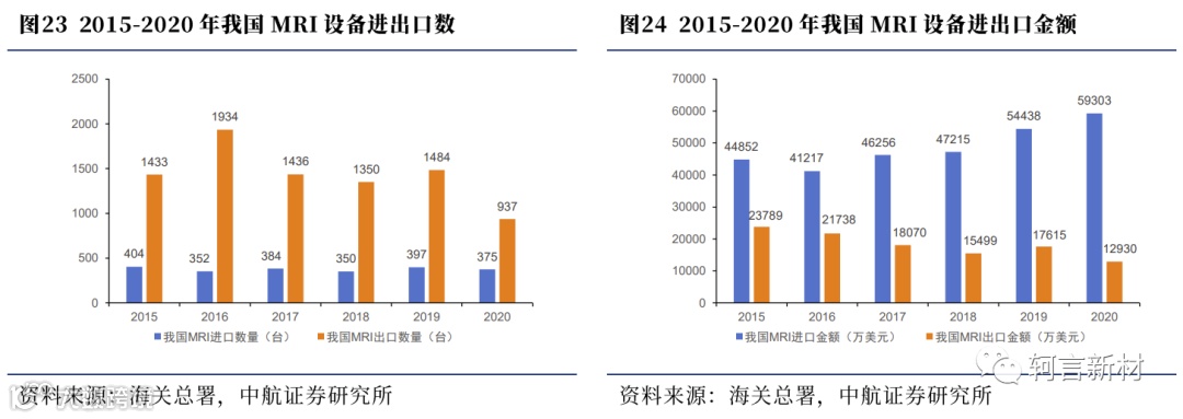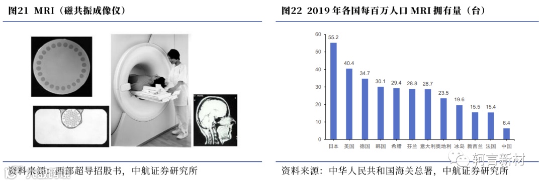 MRI是当前超导材料最主要的应用领域,但目前我国人均MRI拥有量与发达国家仍存在较大差距,需求缺口尚存。MRI是一种生物磁自旋成像技术,其对人体不会产生放射性损伤,对肿瘤早期诊断有较高的临床价值,已经广泛运用于全身各部位脏器的疾病诊断中。根据Statista的数据,2019年我国每百万人口MRI拥有量仅约6.4台,远低于日本的55.2台和美国的40.4台,且多个发达国家每百万人口拥有量在10台以上;由于中国人口数量位居世界第一,MRI拥有量缺口较大,国家已明确将磁共振成像设备列为当前优先发展的高技术产业化重点领域之一。MRI设备进口方面,目前我国主要从德国、荷兰等地进口高端MRI设备,进口数量少,但相对货值较高,未来在高端MRI市场的国产替代空间广阔。医用MRI作为医学影响诊断中心等医疗机构的基本配备要求,在中长期市场的发展有较强确定性,我国在未来有望成为全球最大的MRI市场;