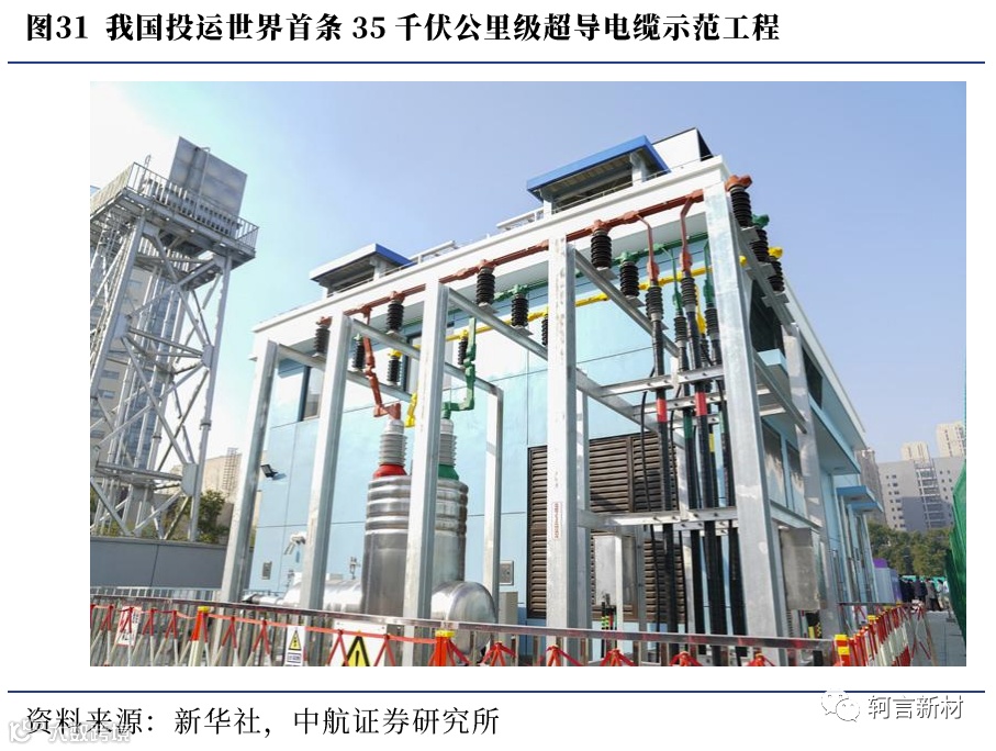 进入二十一世纪以来,国内外在高温超导材料基础研究和超导电力技术研发方面都有长足进展。我国超导电力技术应用研发总体上处于国际同行的前列水平,并具有自身的特色和优势,目前已有多项试验成果为未来高温超导产业化铺路:1)2011年,以西北有色金属研究院、东北大学、中科院电工所为主的单位成功制备出国内第一根千米级MgB2长线,建成继美国、意大利之后国际上第三条千米级MgB2超导线材中试线,标志着绕制大口径MgB2超导磁体成为可能;2)2013年,中国科学院电工研究所研制成的360米、10kA高温超导直流输电电缆于河南中孚实业顺利投入工程示范运行,成为全球范围内传输电流最大的高温超导电缆、首组实现工程示范运行的超导直流电缆;3)2021年12月,全球首条35千伏公里级超导电缆在沪投运,标志着这一国内新型电力系统建设领域关键技术取得了重大突破,有效解决窄通道大容量输电难题,帮助消除负荷热点地区的供电“卡脖子”现象。随着高温超导研究进展和产业化进程的逐步推进,超导电力技术有望辐射国内更多区域,为社会资源的节约提供有力保障;