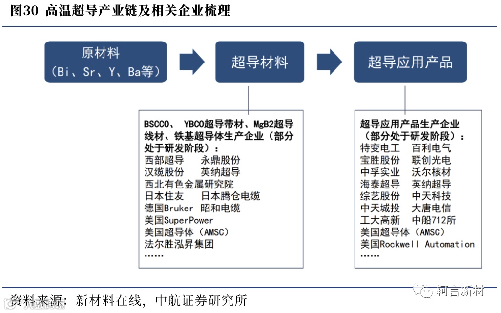 2)中游为超导材料加工环节,主要产品包括BSCCO和YBCO等带材、MgB2线材以及铁基超导体等,是高温超导行业的核心;
