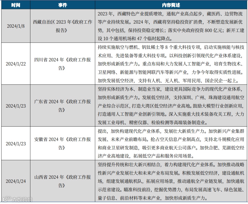 2023年12月中央经济工作会议提出“打造生物制造、商业航天、低空经济等若干战略性新兴产业”,明确强调低空经济发展的重要性。作为创新前沿的热点产业,低空经济的发展得到了不少地方的支持鼓励,各地方政府迅速响应,出台了一系列相关支持政策。据不完全统计,2023年以来已有超过10个省份将低空经济、通用航空等相关内容写入了政府工作报告。安徽、江西、海南、广东等多地就先后举办了低空经济相关的发展大会或论坛、研讨会。
