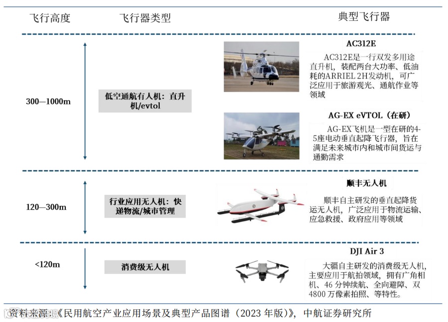 (2)低空航空器:包括直升机、无人机、eVTOL。根据高度划分:120m以下主要包括消费级无人机,120m—300m主要包括行业应用无人机,300m-1000m主要包括直升机/ eVTOL。