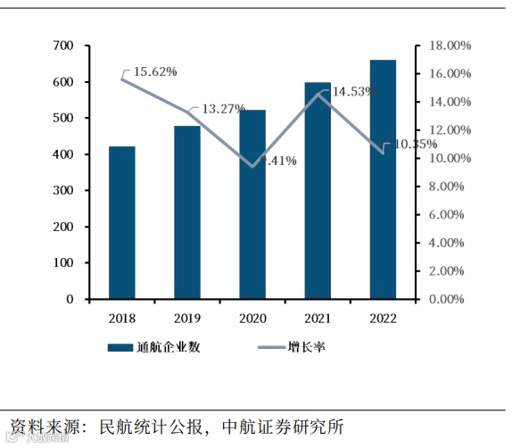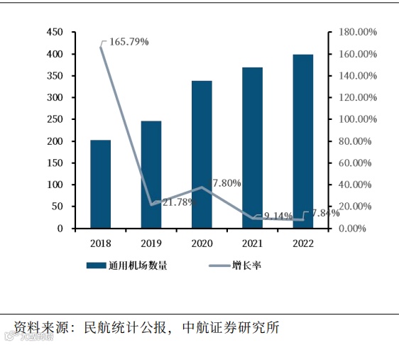 截至2022年底,我国获得通用航空经营许可证的传统通用航空企业661家,比上年底净增62家。其中,华北地区130家,东北地区48家,华东地区179家,中南地区150家,西南地区93家,西北地区37家,新疆地区24家。通用航空机场比上年底净增29个,全国在册管理的通用机场达到399个。