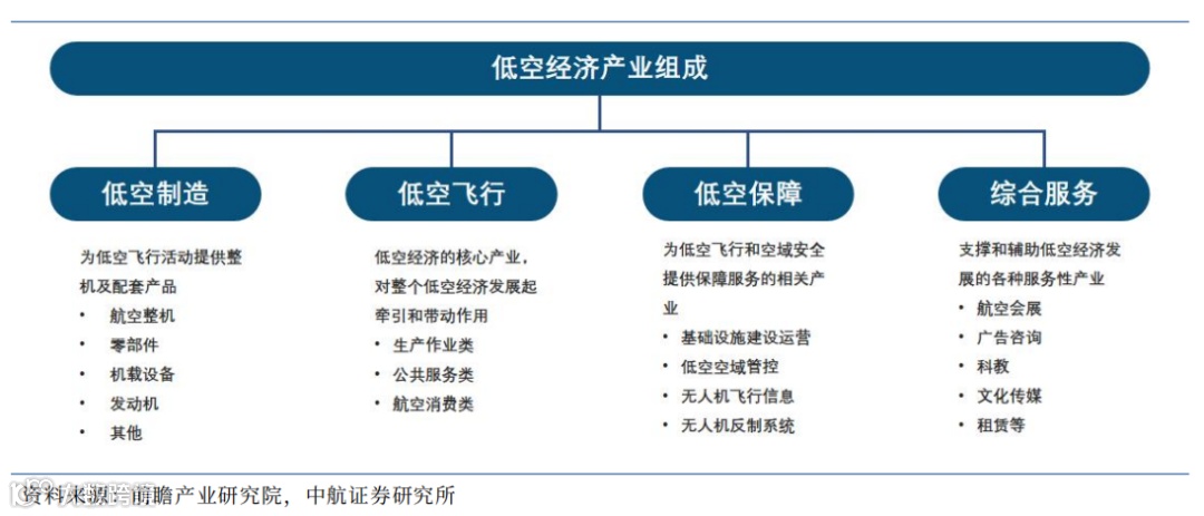 (3) 低空飞行活动:低空飞行活动主要包括警用航空活动、海关航空活动、通用航空以及部分军用航空活动,因此低空经济产业具有涉及民用、警用和军用等多个领域,横贯一二三产业,涵盖上中下游整个发展链条,具有“多领域、跨行业、全链条”特点。