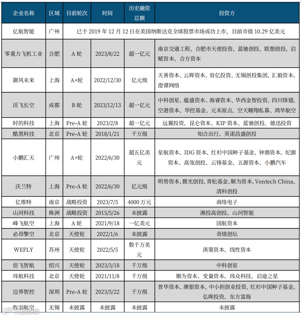 自2023年以来,eVTOL吸引了众多资本的关注和投入。根据统计,2021年发生的融资事件仅有几起,2022年有超过10家厂商融资,2023年也多家企业成功获得融资。从融资细节来看,除了已经美股上市的亿航,小鹏汇天历史融资总额最高,超过5亿美金、峰飞融资总额为1亿美金,御风未来、时的、沃兰特等均进入“亿元俱乐部”,其余多数企业处于天使轮、种子轮、Pre-A轮等千万级初始融资阶段。资本助力下,企业有望在技术迭代、产能建设、场景拓展等方面取得快速突破,为行业快速发展提供充足的资金。