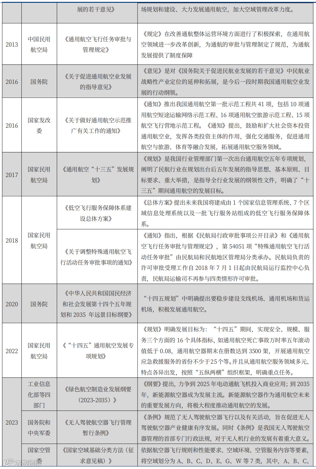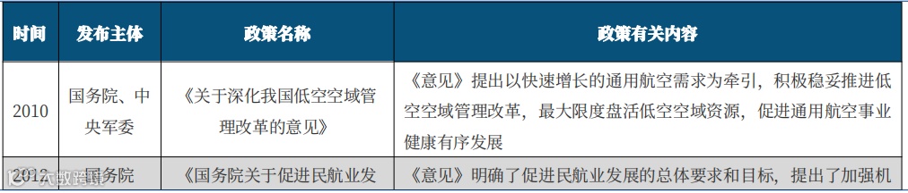早在2010年,中央军委发布的《关于深化我国低空空域管理改革的意见》,明确了低空空域管理改革的目标任务;2012年,《国务院关于促进民航业发展的若干意见》指出要大力发展通用航空,让通用航空产业有法可依;2016年,《国务院办公厅关于促进通用航空业发展的指导意见》对通用航空业与经济融合发展做出的总体谋划和系统部署,为我国通用航空业发展提供了战略指引。但由于低空空域及行业政策法规尚需时间进一步明确和完善,低空经济行业并未得到高速的发展。