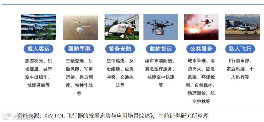 eVTOL飞行器应用场景广泛,是低空经及未来发展的重要方向。eVTOL潜在应用场景涉及城市客运(UAM)、区域客运(RAM)、城市物流配送、商务出行、紧急医疗服务、私用飞行器等多种场景模式,大致可分为载人客运、载物货运、公共服务、警务安防、国防军事及私人飞行等六大类行业场景。