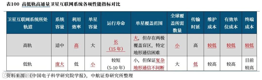 目前,卫星互联网主要可以通过低轨星座组网以及高轨星座组网两种途径实现,不考虑卫星发射,二者其性能与成本的特点如下: