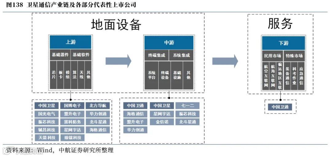 ① 上游的地面设备方面,主要包括卫星地面系统以及卫星通信终端。其中,卫星地面站目前主要由航天科技集团所属单位、部分地方国企及民营商业航天企业构成,而终端设备方面,从基础软件及基础硬件、中游的终端及系统集成均有相对较多的军工央企所属单位、地方国企以及民营企业参与,市场化程度日益加深。