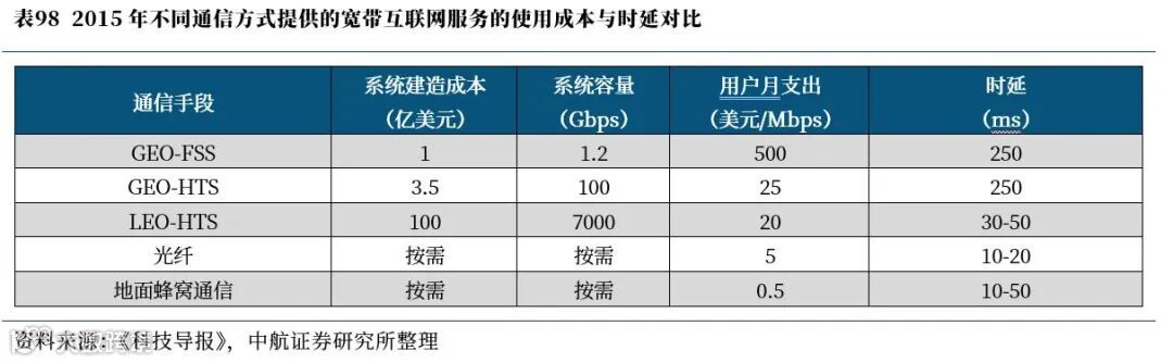 从2015年不同通信方式提供的宽带互联网服务的使用成本和时延(见下表)中可以看出,尽管采用高通量卫星系统(HTS)较传统的固定卫星服务(FSS)在系统建造成本上存在劣势,但在系统容量、用户月支出和时间延迟等性能方面均具有较大优势;部署在低轨的卫星互联网星座由于轨道高度较低,实现卫星组网的卫星数量较大,系统总体容量得到大幅提升,同时系统建造成本也快速增长,但受到与地面站距离的缩短,时间延迟也将快速下降,而部署在高轨的卫星互联网尽管是时间延迟较大,但建造成本低廉。整体来看,尽管卫星互联网通信在成本和性能上仍较传统地面通信存在差距,但与早期的固定卫星服务相比已经有了大幅度提升。