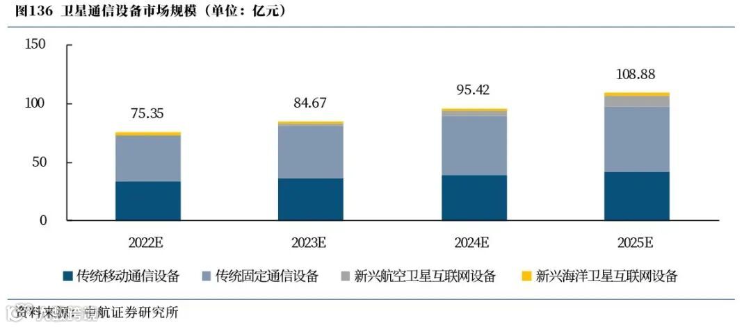 ① 卫星通信设备2025年市场规模有望接近110亿元,年复合增速约13.05%,其中,传统固定通信设备以及新兴航空卫星互联网设备市场增速最快,传统固定通信设备仍然是卫星通信设备市场中市场规模最大的细分领域。