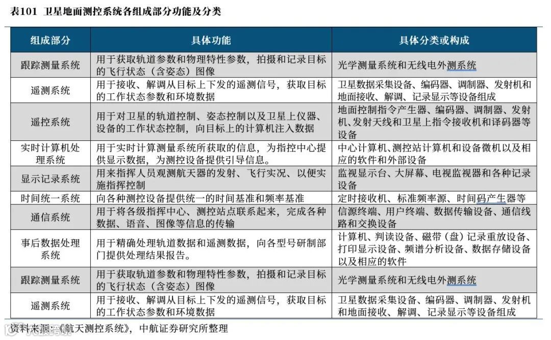 其中,地面测控系统由跟踪测量系统、遥测系统、遥控系统、实时计算机处理系统、显示记录系统、时间统一系统、通信系统以及事后数据处理系统各分系统共同组成。具体各分系统的具体功能及构成如下表所示。