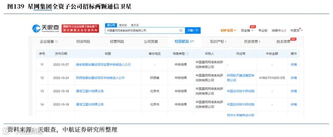 我国卫星互联网空间基础设施以及卫星地面站相关系统配套企业已经拉开扩产建设序幕。从天眼查可以发现,在2022年10月中旬,星网集团全资子公司中国星网网络系统研究院有限公司完成了两个通信卫星项目的招标,结合在12月7日IPO过会企业航天环宇在招股书中披露中关于“公司所研制的产品主要面向中国电科、中国电子、中国星网、航天科技等下属总体单位”、“在低轨卫星互联网信关站产品上,在国内率先完成4.5米QV频段天线分系统的研制”等等表述,同时航天环宇拟募集资金6.00亿元用于投资建设卫星通信、测控与测试装备产业化项目,项目产品包括生产卫星通信产品、地面测控装备、特种测试装备、星载通信有效载荷等四大类。