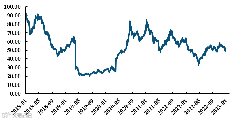 我们对中航证券军工材料指数标的进行PE(TTM)统计,截至2023年1月末指数市盈率为55.07倍,较上月增加5.81%,处于2018年以来的54%分位。