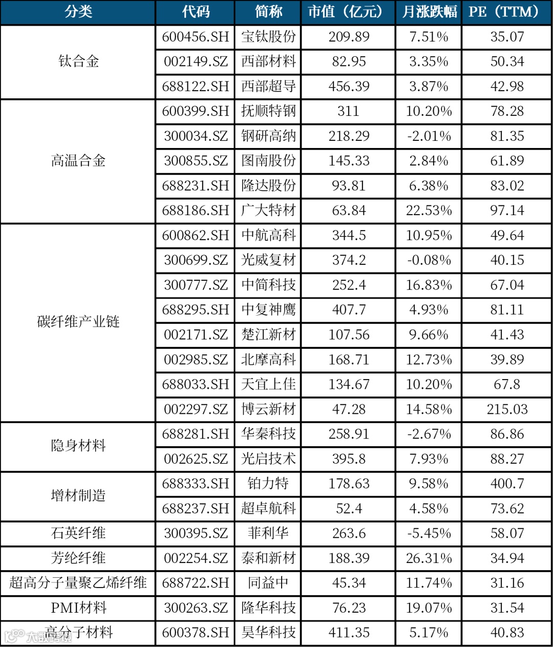 光威复材、中简科技、中复神鹰(碳纤维复合材料);抚顺特钢、钢研高纳(高温合金);西部超导、宝钛股份(钛合金);北摩高科(碳碳复材)。