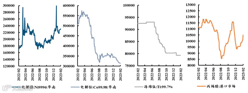 钛合金方面,1月海绵钛价格(7.94万元/吨,0.00%)维持平稳,整体供需关系相对稳定。截至1月31日,海绵钛价格从去年6月高位(9.3万元/吨)回落1.37万元/吨,幅度近15%,对钛合金企业成本压力明显减轻,考虑到钛合金企业存在生产周转差,周期在一个季度到半年不等,预计海绵钛降价影响在2022Q4或2023年有所体现,后市需持续关注。