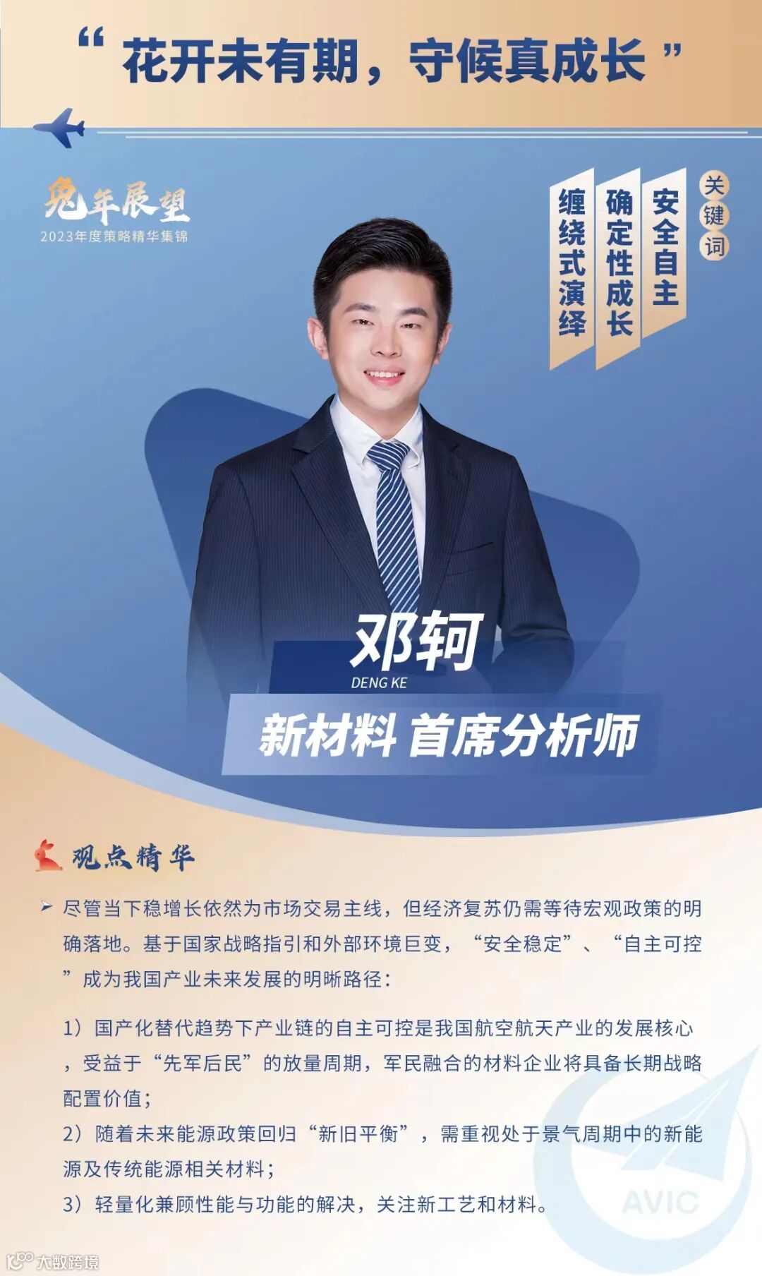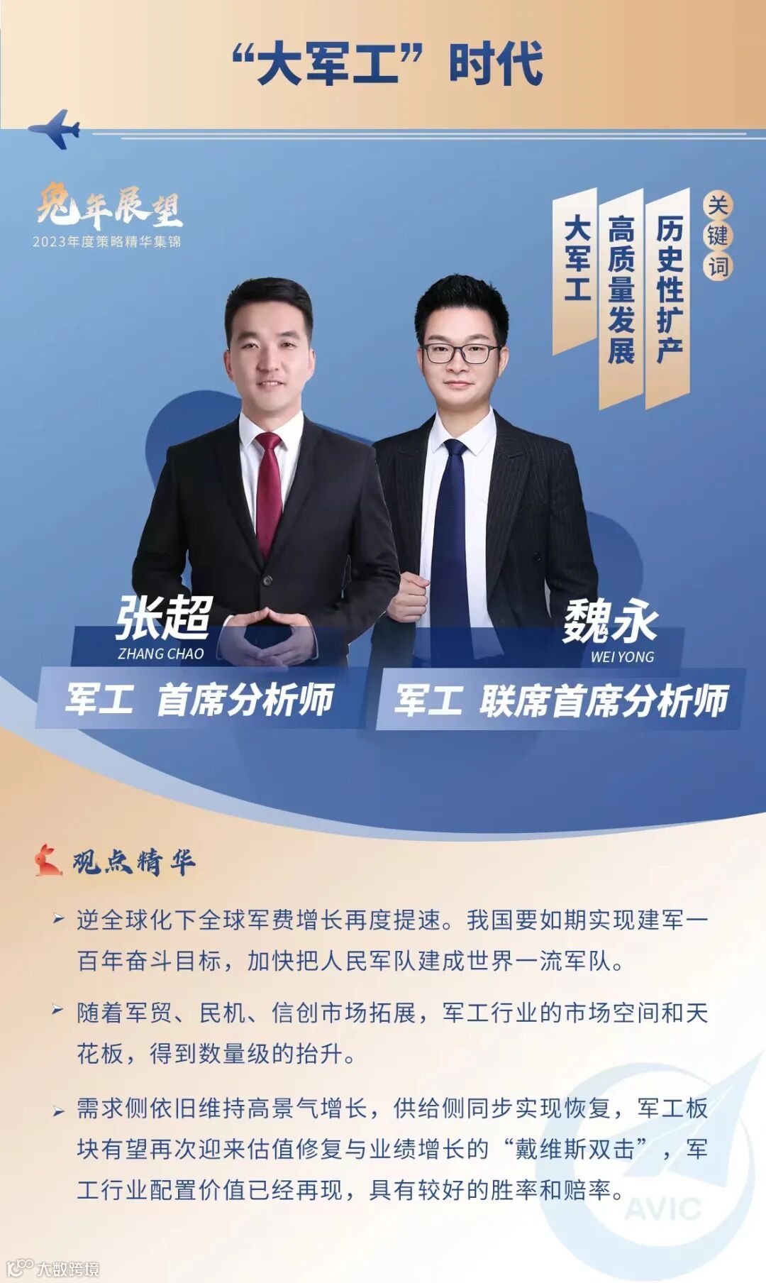 引用中航证券新年贺词的一句话“实干担当赴新程,团结奋斗向未来”,作为我国军工央企下属唯一的证券公司,我们坚持“投研引领、精品特色”打造研究所。2022年我们获得了上证报进步最快研究机构、每市券商金股收益率排名第一等集体荣誉。未来我们将继续拥抱产业、深度前瞻、客观独立,同时不乏创造力,持续为市场奉献高质量研究成果,特色的军工指数编制及ETF产品开发。期望与您继续同行在2023年投研之路,我们也对这条收获之路充满信心。