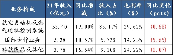 航空发动机及燃气轮机控制系统,全方位参与国内所有在役、在研型号的航空发动机控制系统研制生产;收入规模稳健增长,毛利率保持在较高的水平。国际合作主要为国外航空企业提供民航精密零部件的生产,受全球疫情的影响毛利率出现比较明显的下滑。非航空及其他业务主要以动力控制系统核心技术为依托,重点向兵器、汽车等领域拓展,收入稳健增长,毛利率小幅下滑。