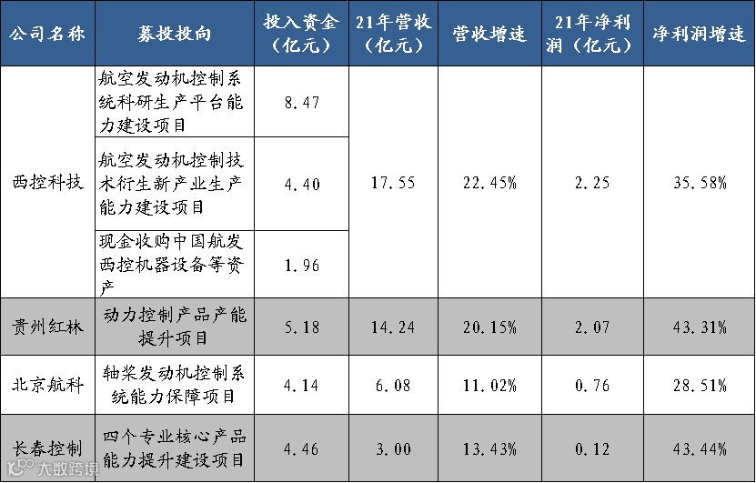 随着国家航空发动机及燃气轮机重大专项等多项政策落地实施,对军民用发动机发展的全面规划,将为航空发动机控制系统产品带来巨大的市场空间。公司本轮定增覆盖了公司及子公司各项科研生产能力建设项目,有助于快速有效对接“两机”专项任务,补充短板、提升能力,也将有力支撑公司业务规模持续扩大,产品盈利能力提升,助推公司高质量发展。