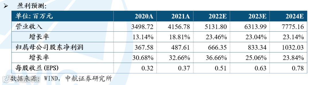 基于以上观点,我们预计公司2022-2024年的营业收入分别为51.32亿元、63.14亿元和77.75亿元,归母净利润分别为6.66亿元、8.33亿元及10.32亿元,EPS分别为0.51元、0.63元、0.78元,我们给予目标价格31.42元,分别对应62倍、50倍及40倍PE。