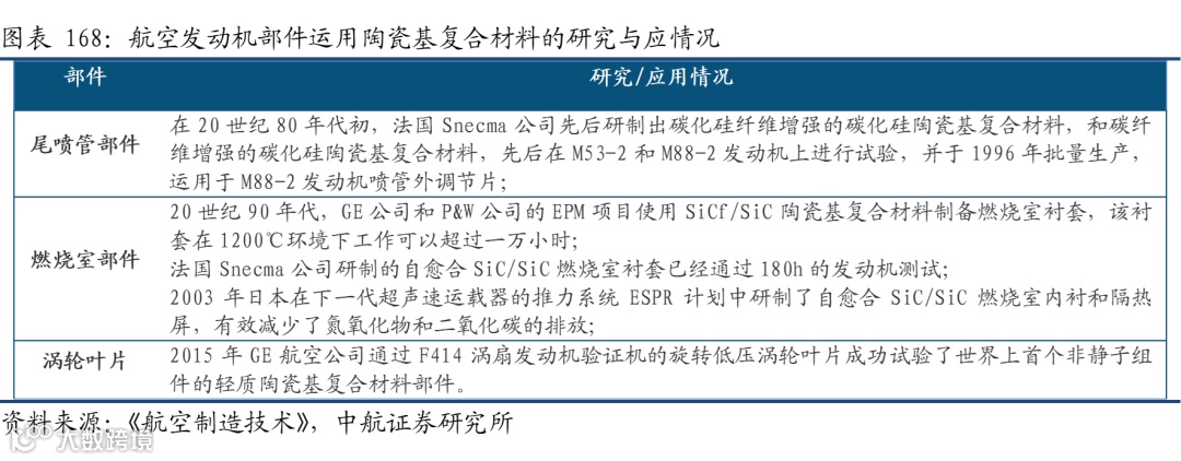 在新一代高性能发动机中,陶瓷基复合材料得到应用。如美国F-119发动机的矢量喷管内壁板、F-414发动机的燃烧室均使用该材料,改进了部件的热力和应力分析,减少了冷却用空气量,在民用发动机方面,罗罗公司trent800的扇形涡轮外环、我国C919的LEAP-X发动机涡轮导向器叶片、壳环也采用陶瓷基材料,其效果已经得到验证。2015年,通用航空GE开始在新型发动机LEAP和GE9X上使用陶瓷基复合材料配件,包括在LEAP发动机上使用陶瓷基复合材料制的涡轮罩环,以及在下一代引擎——GE9X上使用陶瓷基复合材的涡轮喷嘴、燃烧室衬套。随着民用航空业对提高燃油效率的不断追求,通用航空GE预计在今后十年陶瓷基复合材料在航空中的应用将增长十倍。
