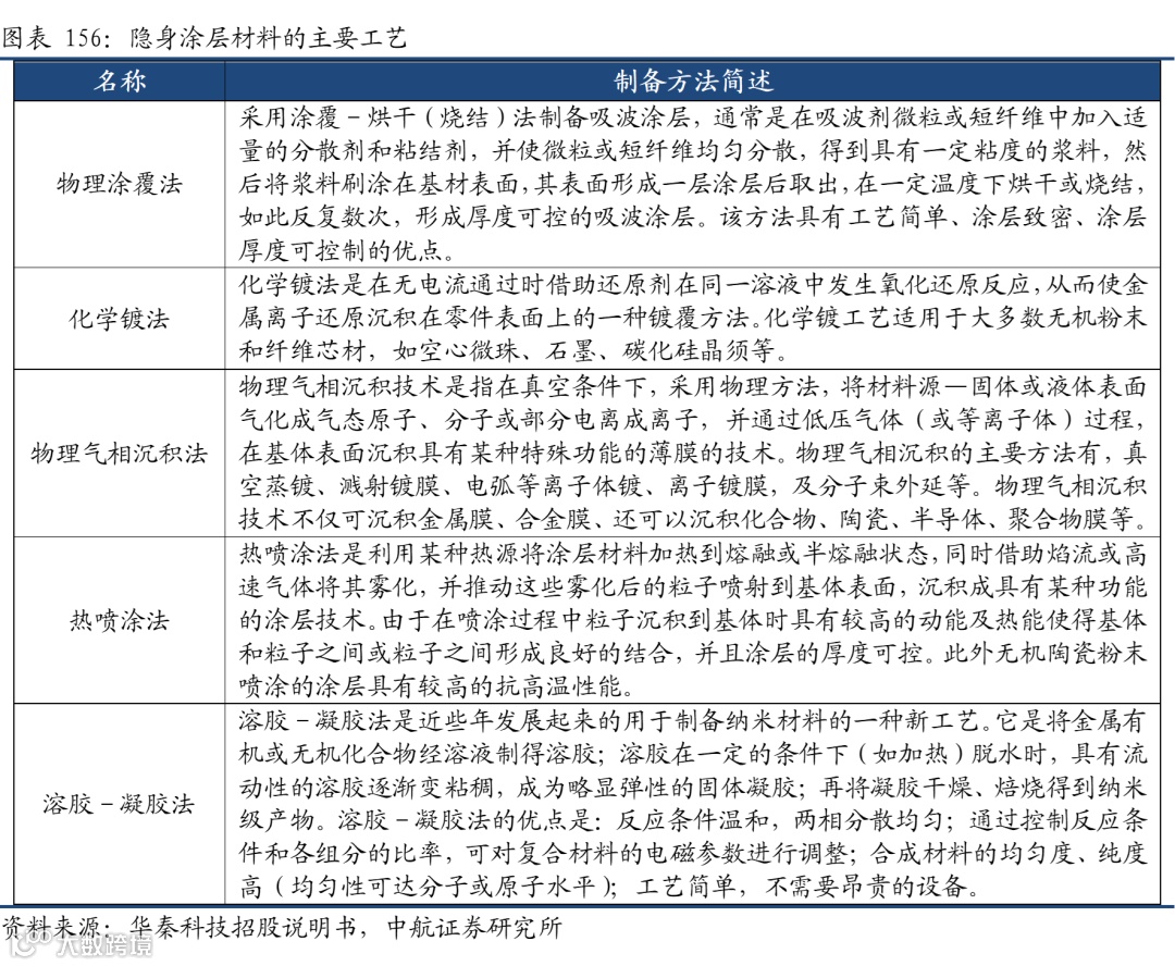 不同隐身材料工艺也大不相同。从两种主要成型工艺的隐身材料(隐身涂层材料和结构隐身材料)来看:隐身涂层材料的主要工艺包括物理涂覆、化学镀、物理气相沉积、热喷涂和溶胶-凝胶技术等。