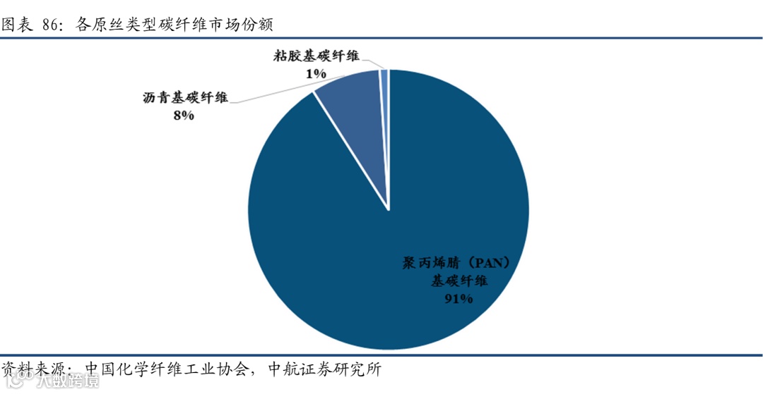 目前只有沥青纤维、聚丙烯睛(PAN)纤维和粘胶(纤维素)基纤维三种原料制备碳纤维工艺实现了工业化。聚丙烯腈(PAN)基碳纤维产量占产业总量的90%以上,粘胶基碳纤维占比只有1%左右。