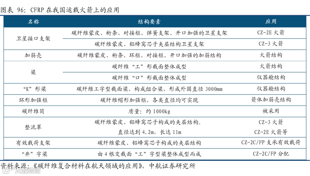 用于运载火箭,T300级、T700级、T800级碳纤维已经大量应用于国外先进运载火箭,包括火箭整流罩、仪器舱、壳体、级间段、发动机喉衬和喷管等。