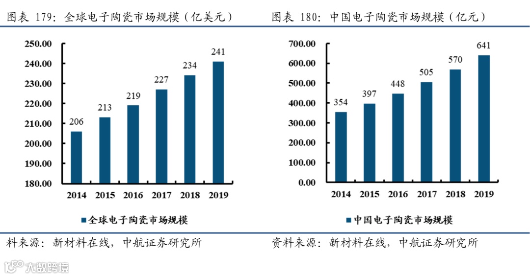 电子陶瓷占据功能陶瓷大部分市场份额。目前在功能陶瓷中,电子陶瓷占据了大部分市场分,电子陶瓷是现代信息技术中的关键性基础材料,主要用于芯片、电容、集成电路封装、传感器、绝缘体、铁磁体、压电陶瓷、半导体、超导等,广泛应用于通信、计算机、航空航天、医疗、汽车、军工、新能源等终端领域。随着信息化产业、电子消费产业的快速发展,工业用电子产品、消费电子产品将保持快速发展趋势,对电子陶瓷的需求巨大,2019年全球电子陶瓷市场规模在241亿美元。中国市场方面,2019年,我国电子陶瓷市场规模达到641亿元。