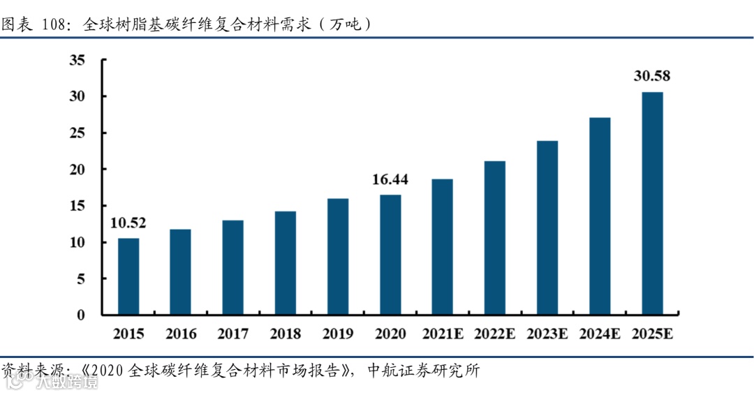 从碳纤维复合材料的方面来看,2020年全球树脂基碳纤维复合材料的需求量为16.44万吨,根据树脂基占比在70%左右,预计2020年总碳纤维复合材料的需求超过23万吨。